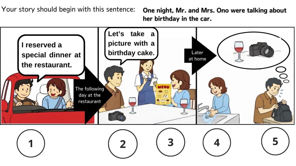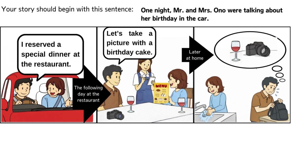 ① Mr. Ono said, “I reserved a special dinner at the restaurant.” The following day at the restaurant, ②Mr. Ono said, “Let’s take a picture with a birthday cake.” ③Mrs. Ono was ordering some food. Later at home, ④Mrs. Ono was washing her hands. ⑤Mr. Ono noticed that he had left his camera at the restaurant.