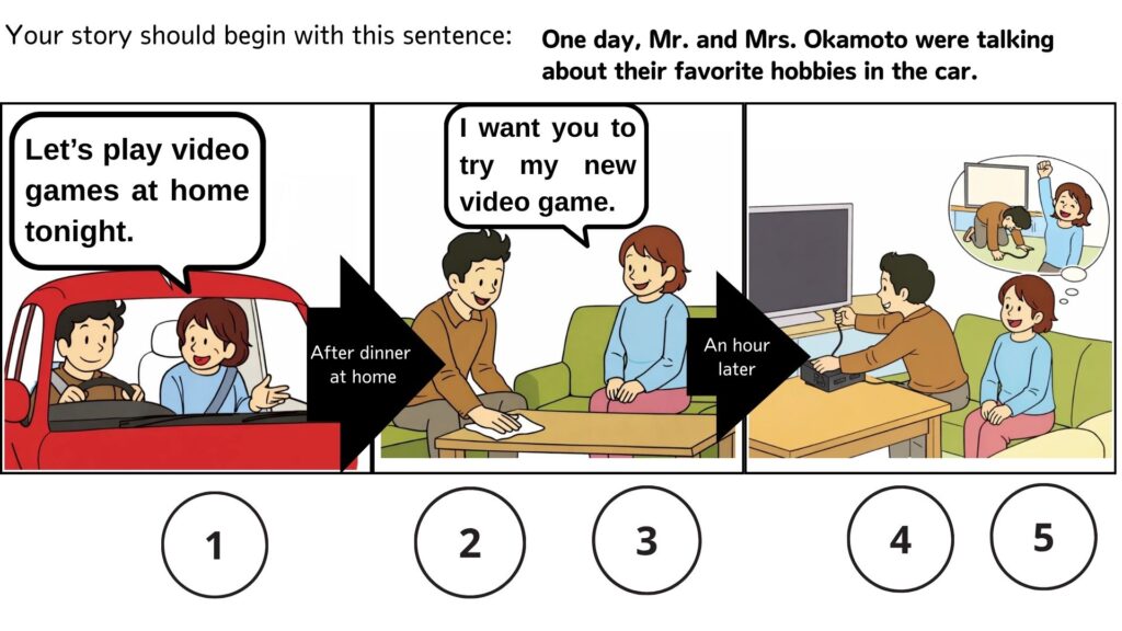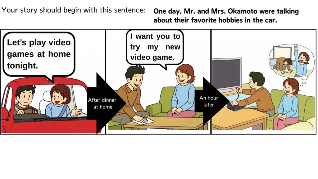 One day, Mr. and Mrs. Okamoto were talking about their hobbies in the car. ①Mrs. Okamoto said, “Let’s play video games at home tonight.” After dinner at home, ②Mr. Okamoto was cleaning the table. ③Mrs. Okamoto said, “I want you to try my new game.” An hour later, ④Mr. Okamoto was preparing the game. ⑤Mrs. Okamoto was looking forward to winning.